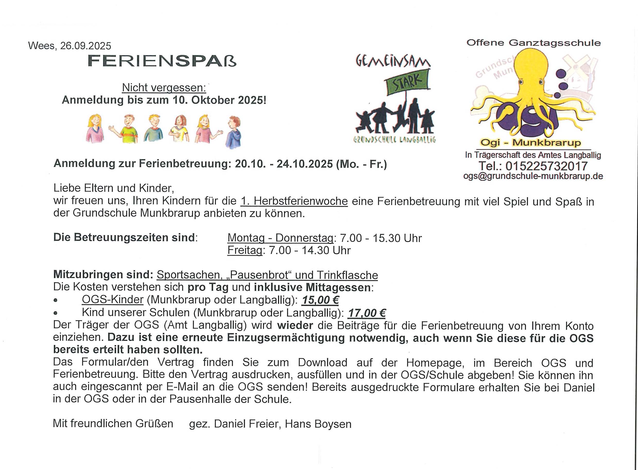 Liebe Eltern und Erziehungsberechtigte, hier finden Sie die Infos und Anmeldeformulare zur Ferienbetreuung Herbst 2025 zum Download.